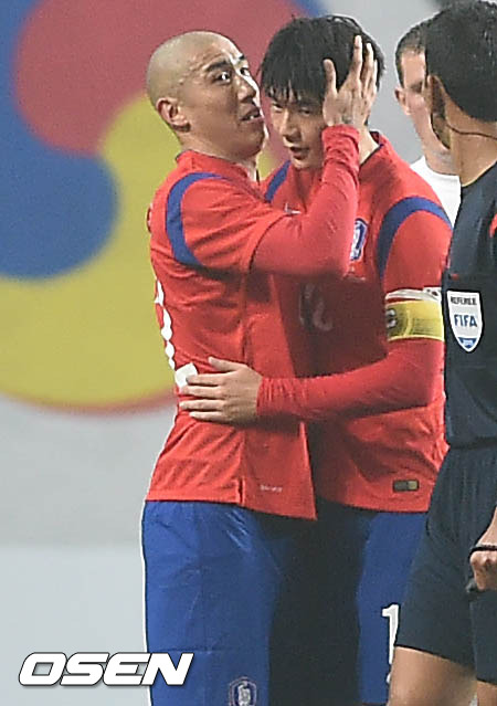 31일 오후 서울월드컵경기장에서 열린 한국과 뉴질랜드의 평가전, 전반전 대한민국 차두리가 교체되며 기성용과 포옹을 나누고 있다.