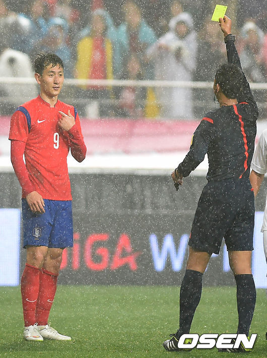 31일 오후 서울월드컵경기장에서 열린 한국과 뉴질랜드의 평가전, 후반전 대한민국 지동원이 옐로카드를 받고 있다.