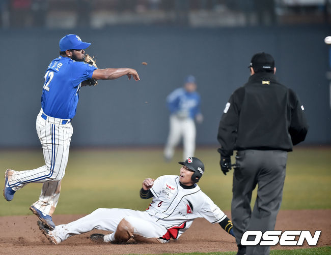 31일 오후 수원케이티위즈파크 열린 '2015 타이어뱅크 KBO 리그' kt와 삼성의 경기 7회말 김사연의 3루수 앞 땅볼때 삼성 2루수 나바로가 2루에서 박경수를 포스아웃 시킨 후 1루로 송구하고 있다.