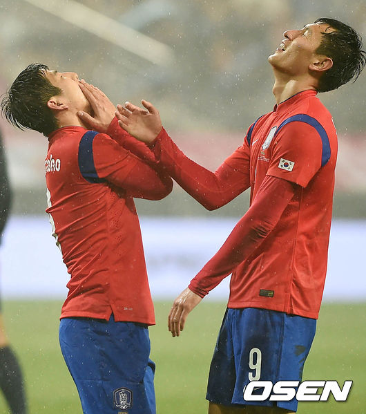 31일 오후 서울월드컵경기장에서 열린 한국과 뉴질랜드의 평가전, 후반전 대한민국 박주호의 슈팅이 골문을 벗어나자 지동원과 아쉬워하고 있다.
