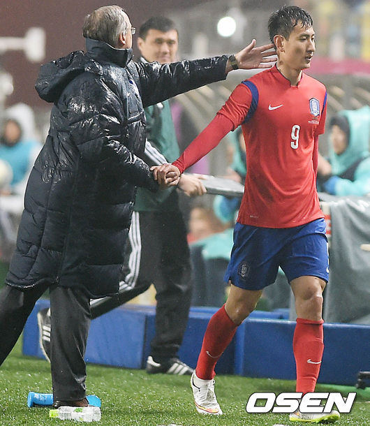 31일 오후 서울월드컵경기장에서 열린 한국과 뉴질랜드의 평가전, 후반전 지동원이 교체되어 들어가며 슈틸리케 감독과 인사하고 있다.