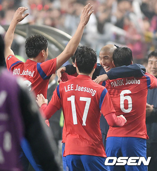 31일 오후 서울월드컵경기장에서 열린 한국과 뉴질랜드의 평가전, 후반전 대한민국 이재성이 선제골을 성공시키고 기쁨을 나누고 있다.