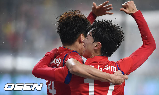 31일 오후 서울월드컵경기장에서 열린 한국과 뉴질랜드의 평가전, 후반전 대한민국 이재성이 선제골을 성공시키고 기쁨을 나누고 있다.
