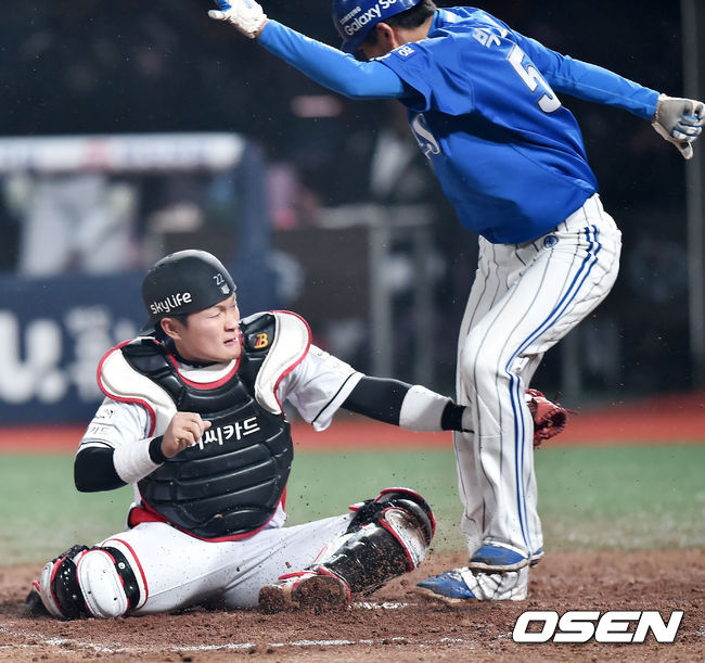 31일 오후 수원케이티위즈파크 열린 '2015 타이어뱅크 KBO 리그' kt와 삼성의 경기 9회초 1사 주자 2,3루 삼성 박해민의 1루수 앞 땅볼때 kt 안중열이 삼성 박찬도를 홈에서 태그아웃 시키고 있다.