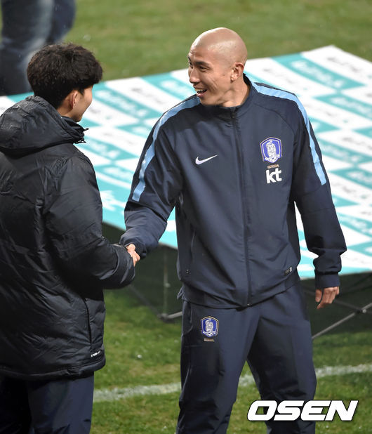 경기가 끝나고도 손흥민이 아쉬움에 차두리의 손을 놓지 못하고 있다./spjj@osen.co.kr