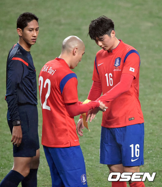 하프타임에 벌어진 은퇴식에서 차두리가 기성용에게 주장 완장을 채워주고 있다./spjj@osen.co.kr