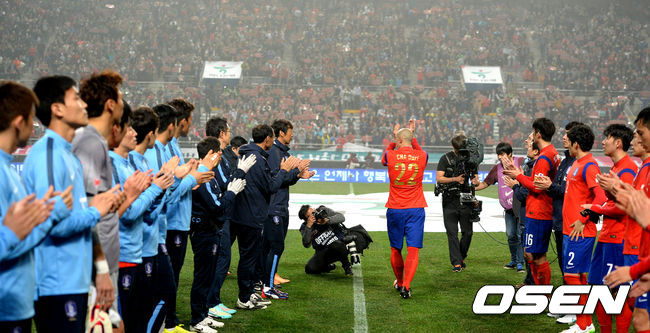 사진은 하프타임에 도열한 코칭스태프, 동료들의 환영을 받으며 그라운드에 입장하는 차두리. /jpnews@osen.co.kr