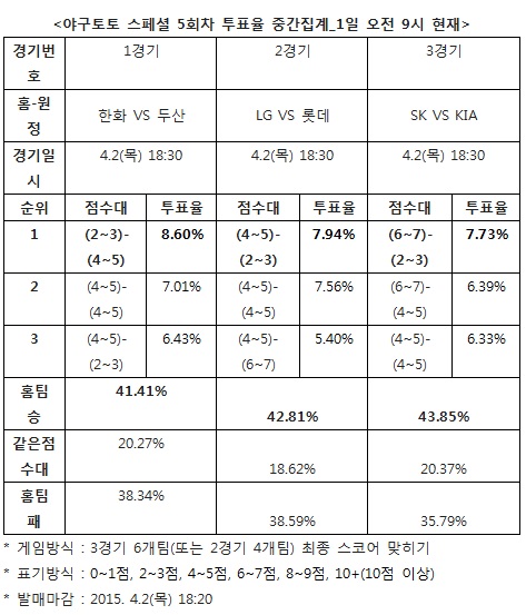 [야구토토] 국민체육진흥공단(www.kspo.or.kr)이 발행하는 체육진흥투표권 공식 온라인 발매 사이트 베트맨(www.betman.co.kr)이 2일에 열리는 2015시즌 한국프로야구(KBO) 3경기를 대상으로 한 야구토토 스페셜 5회차 투표율을 중간 집계한 결과, 참가자의 43.85%는 SK-KIA(3경기)전에서 SK가 KIA에 승리할 것이라 예상했다.