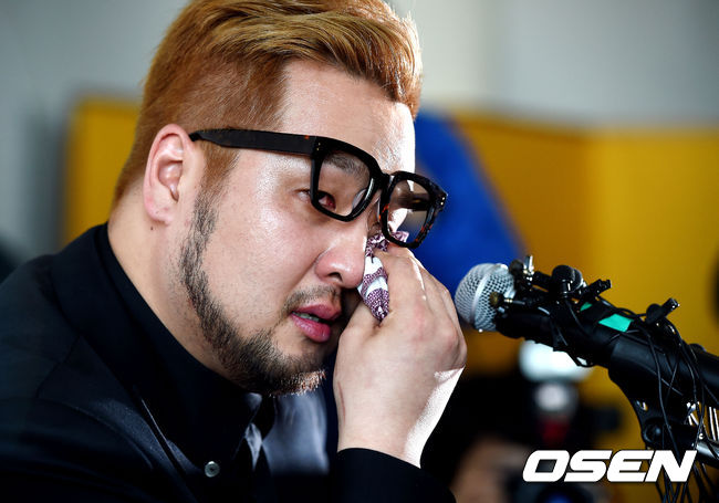 김태우가 기자회견 도중 눈물을 흘리고 있다.