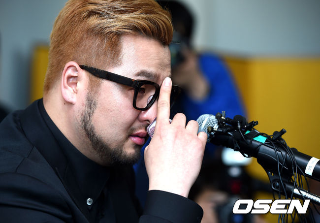 김태우가 기자회견 도중 눈물을 흘리고 있다.