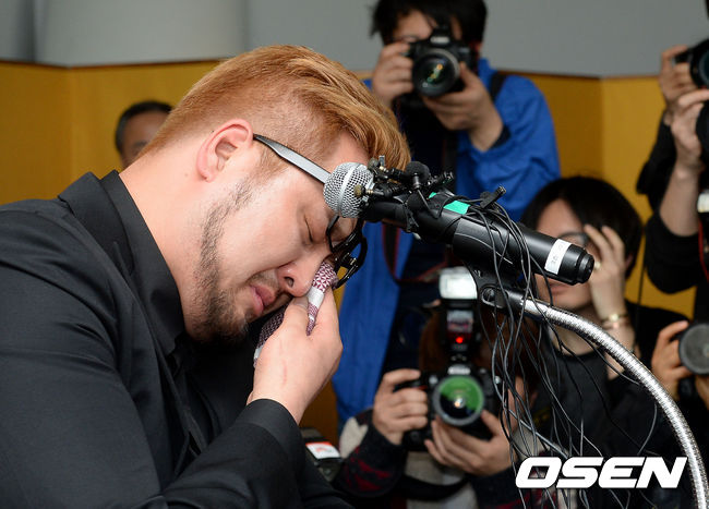 김태우가 기자회견 도중 눈물을 흘리고 있다.