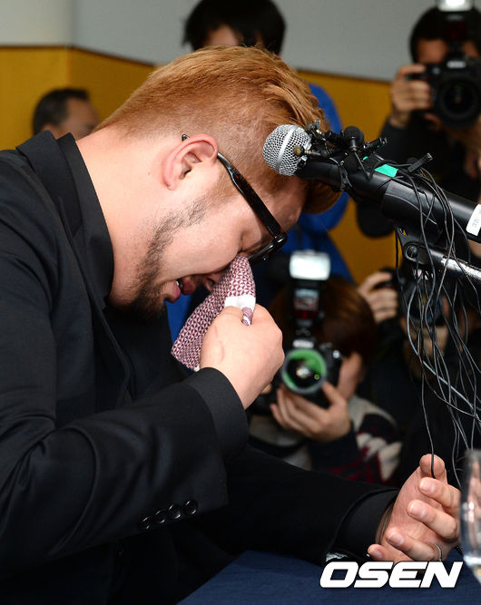 김태우가 기자회견 도중 눈물을 흘리고 있다.