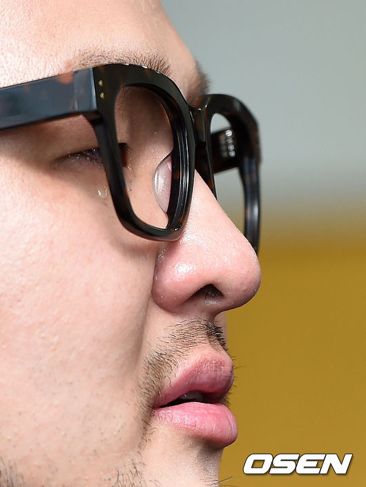 김태우가 기자회견 도중 눈물을 흘리고 있다.