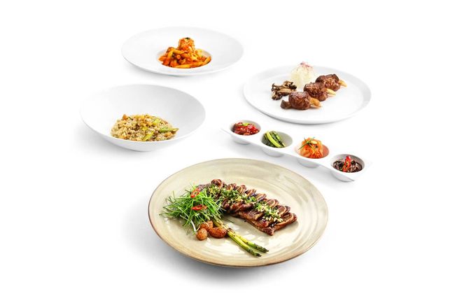 메인 메뉴로는 떡갈비, LA갈비 구이와 함께 전복과 아스파라거스 리조또, 김치 펜네 파스타, 매생이 링귀니 파스타 등 한식을 접목시킨 퓨전 이태리 요리에 주목할 만 하다.