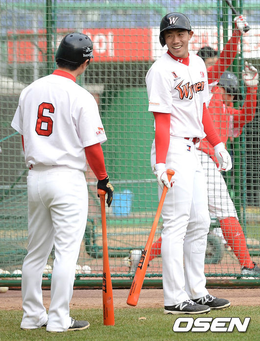 1일 오후 인천SK행복드림구장에서 열리는 '2015 타이어뱅크 KBO 리그' SK 와이번스와 KIA 타이거즈의 경기 시작전 이명기와 김성현이 이야기를 나누고 있다.