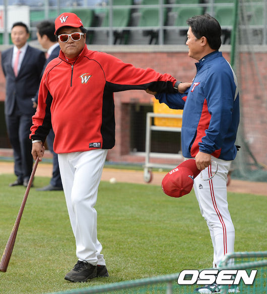 1일 오후 인천SK행복드림구장에서 열린 '2015 타이어뱅크 KBO 리그' SK 와이번스와 KIA 타이거즈의 경기 시작전 김무관 코치와 박흥식 코치가 인사를 나누고 있다.
