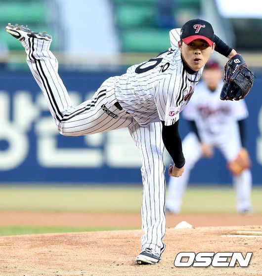 LG 선발 임정우가 힘차게 공을 뿌리고 있다.