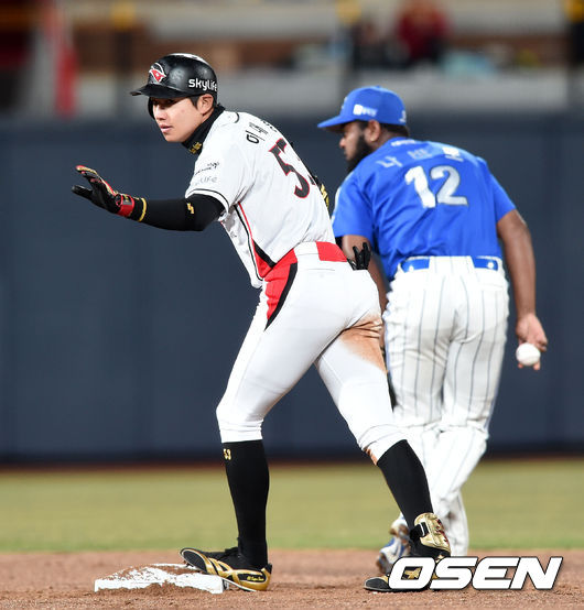 3회말 1사 1루에서 kt 이대형이 좌중간을 가르는 안타를 치고 2루에서 타임을 외치고 있다.