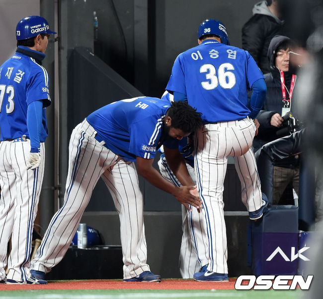 4회초 1사 1,2루에서 삼성 이승엽이 우전 2타점 적시 3루타를 치고 3루로 가는 과정에서 허벅지 통증을 호소하자 나바로가 마사지를 해주고 있다.