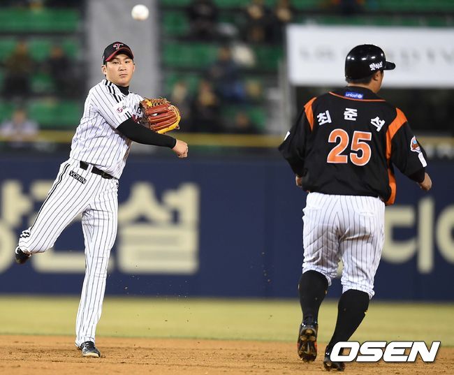 4회초 롯데 공격 무사 1루 상황 김대우의 병살타 때 LG 유격수 오지환이 주자 최준석을 포스아웃 시킨 뒤 1루로 송구하고 있다.