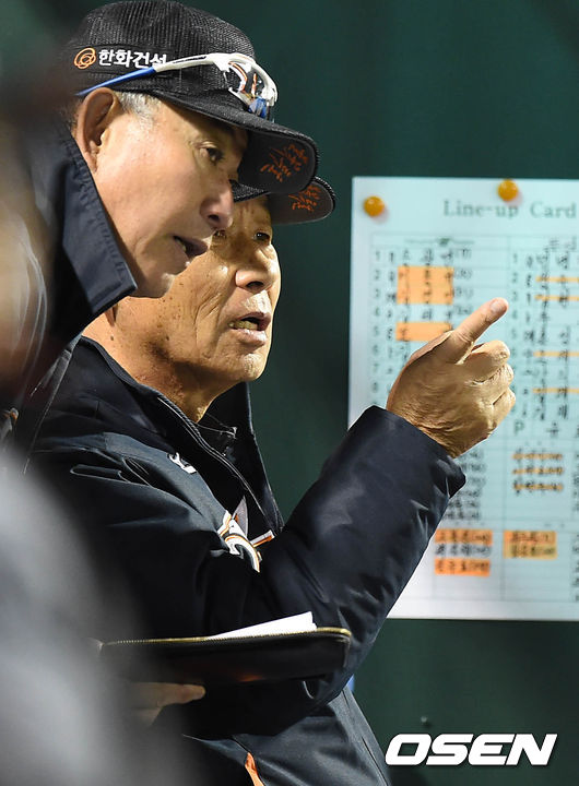 1일 오후 대전 한화생명이글스파크에서 열린 '2015 타이어뱅크 KBO 리그' 한화 이글스와 두산 베어스의 경기, 한화 이글스 김성근 감독이 작전을 지시하고 있다.