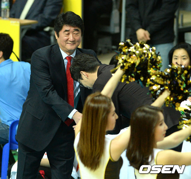 경기에 앞서 삼성화재 신치용 감독과 OK저축은행 김세진 감독이 인사를 나누고 있다.