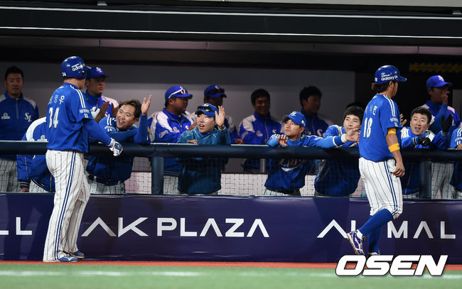 4회초 1사 1,2루에서 삼성 이승엽의 우전 2타점 적시 3루타때 1루주자 최형우와 2루주자 박석민이 더그아웃에서 하이파이브를 하고 있다.