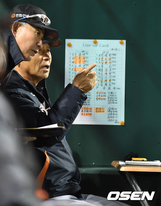 1일 오후 대전 한화생명이글스파크에서 열린 '2015 타이어뱅크 KBO 리그' 한화 이글스와 두산 베어스의 경기, 한화 김성근 감독이 작전을 지시하고 있다.