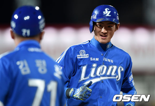 4회초 1사 3루에서 삼성 구자욱이 적시타를 치고 미소를 짓고 있다.