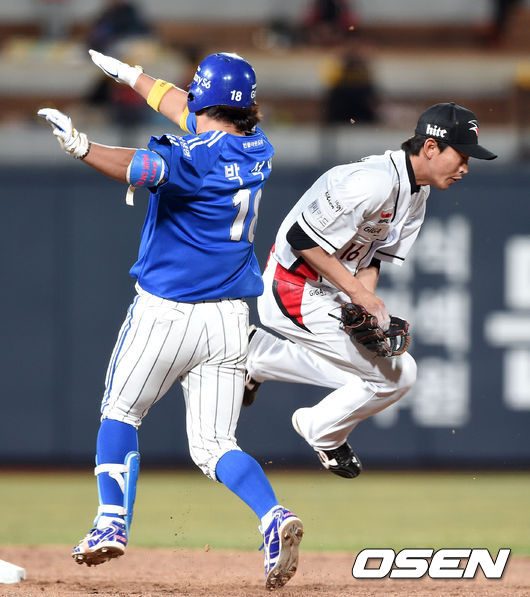 5회초 2사에서 삼성 박석민이 우전 안타를 치고 2루에서 세이프 되고 있다.