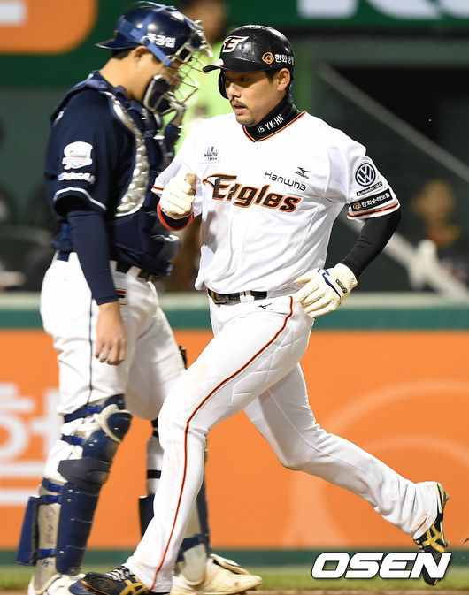 1일 오후 대전 한화생명이글스파크에서 열린 '2015 타이어뱅크 KBO 리그' 한화 이글스와 두산 베어스의 경기, 4회말 무사 만루 한화 모건의 희생플라이에 3루주자 이용규가 홈을 밟고 있다.