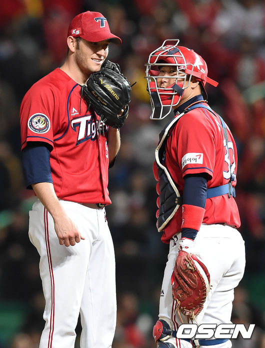 1일 오후 인천SK행복드림구장에서 열린 '2015 타이어뱅크 KBO 리그' SK 와이번스와 KIA 타이거즈의 경기 6회말 1사 1루, 스틴슨과 이성우가 마운드에서 이야기를 나누고 있다.