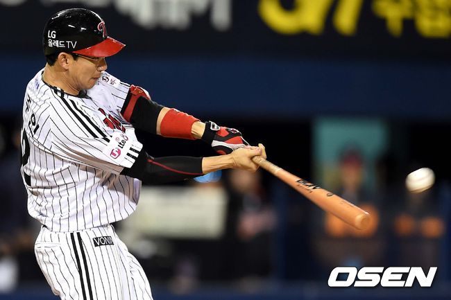 5회말 LG 공격 1사 1루 상황 손주인이 추격의 1타점 좌익선상 2루타를 날리고 있다.
