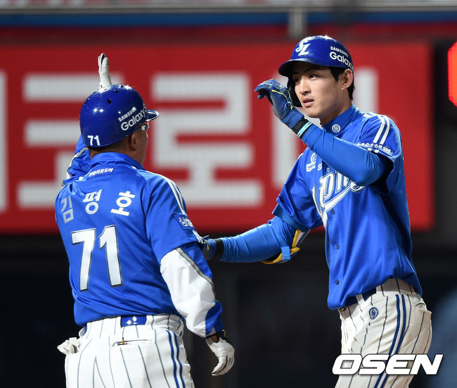 6회초 1사에서 삼성 구자욱이 우월 솔로 홈런을 치고 홈에서 김평호 코치와 하이파이브를 하고 있다.