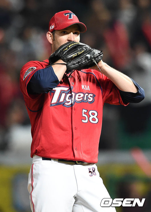 1일 오후 인천SK행복드림구장에서 열린 '2015 타이어뱅크 KBO 리그' SK 와이번스와 KIA 타이거즈의 경기 6회말 2사 1,3루 최정을 볼넷으로 내보내고 스틴슨이 글러브로 얼굴을 가리고 있다.