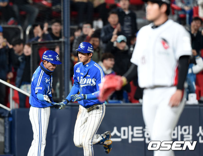 6회초 1사에서 삼성 구자욱이 우월 솔로 홈런을 치고 그라운드를 달리고 있다.