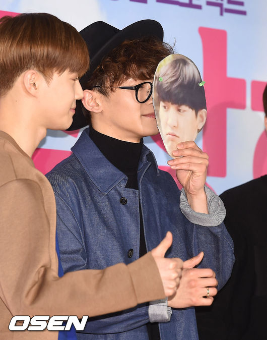 1일 오후 서울 영등포 CGV에서 진행된 영화 '장수상회' VIP 시사회에 참석한 엑소 첸이 찬열이 마스크를 들고 포토타임을 하고 있다.