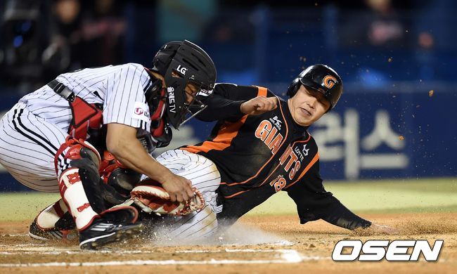 6회초 롯데 공격 1사 3루 상황 정훈의 내야 땅볼 때 홈으로 쇄도한 주자 김대우가 LG 포수 최경철의 블로킹에 막혀 아웃되고 있다.