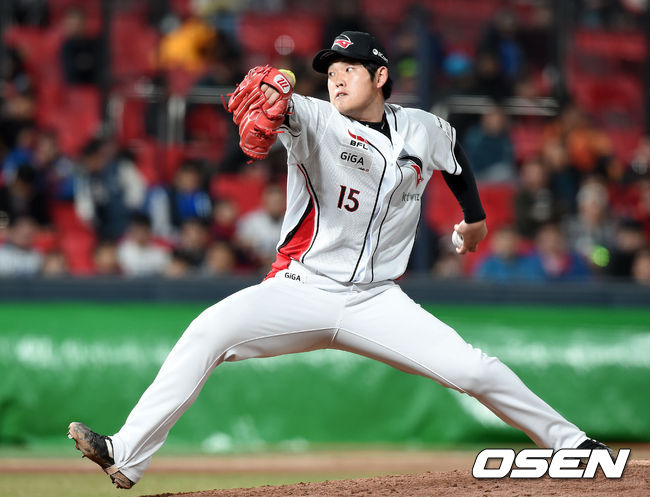 6회초 kt 박세웅과 교체된 정대현이 힘차게 공을 던지고 있다.
