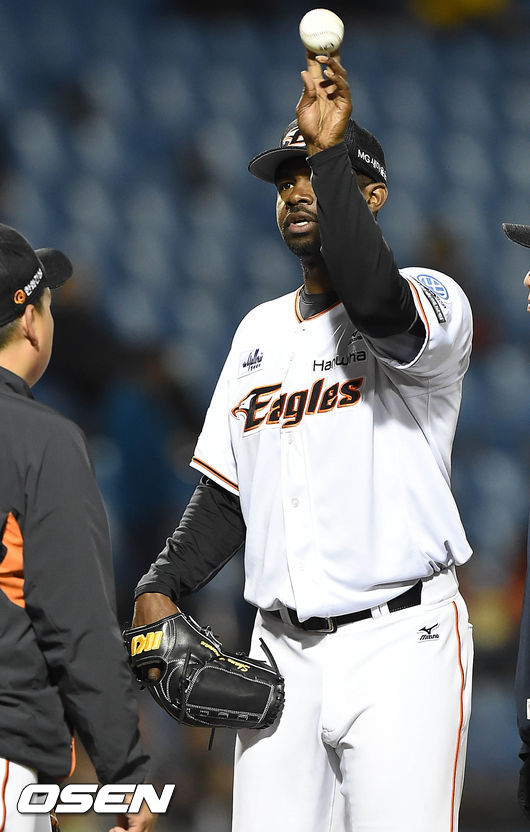 1일 오후 대전 한화생명이글스파크에서 열린 '2015 타이어뱅크 KBO 리그' 한화 이글스와 두산 베어스의 경기, 6회초 1사 주자 1루, 한화 선발 투수 유먼이 교체되어 마운드를 내려가고 있다.