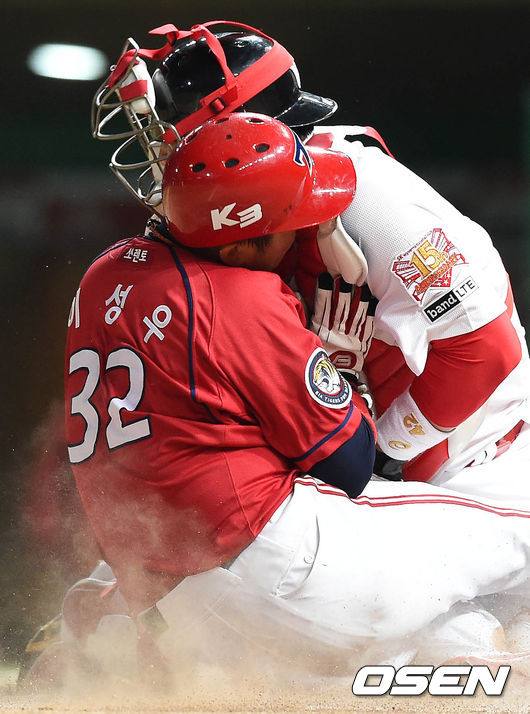 1일 오후 인천SK행복드림구장에서 열린 '2015 타이어뱅크 KBO 리그' SK 와이번스와 KIA 타이거즈의 경기 7회초 1사 1,3루 최용규의 내야땅볼 상황, 3루주자 이성우가 홈으로 쇄도하다 홈에서 정상호와 충돌하고 있다. 이성우는 아웃.