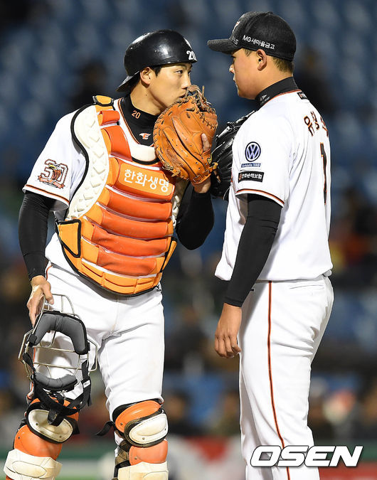 1일 오후 대전 한화생명이글스파크에서 열린 '2015 타이어뱅크 KBO 리그' 한화 이글스와 두산 베어스의 경기, 6회초 2사 주자 2,3루 한화 유창식이 두산 김재호에게 볼넷을 허용하고 주자가 만루가 되자 정범모 포수가 마운드를 방문하고 있다.