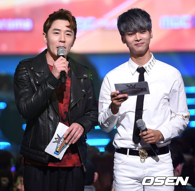 1일 오후 일산 MBC 일산드림센터에서 진행된 MBC플러스미디어 창사특집 '쇼 챔피언' 생방송에서 붐과 VIXX 엔이 사회를 맡아 인사를 하고 있다.