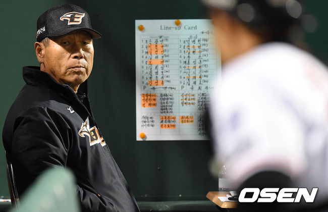 1일 오후 대전 한화생명이글스파크에서 열린 '2015 타이어뱅크 KBO 리그' 한화 이글스와 두산 베어스의 경기, 한화 김성근 감독이 더그아웃에 자리하고 있다.
