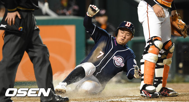1일 오후 대전 한화생명이글스파크에서 열린 '2015 타이어뱅크 KBO 리그' 한화 이글스와 두산 베어스의 경기, 7회초 1사 주자 1,3루 두산 최주환의 양의지에 희생플라이에 홈쇄도하고 있다.