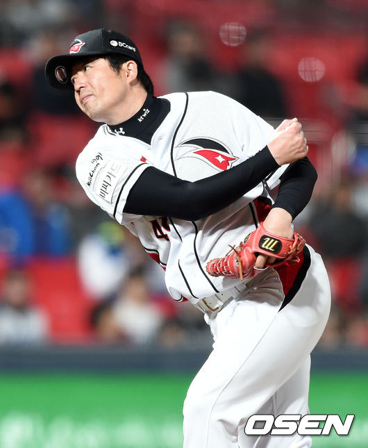 9회초 kt 김기표가 힘차게 공을 던지고 있다.