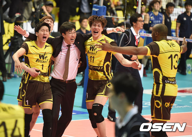 OK저축은행 김세진 감독이 우승이 확정되며 선수들과 기뻐하고 있다. /jpnews@osen.co.kr