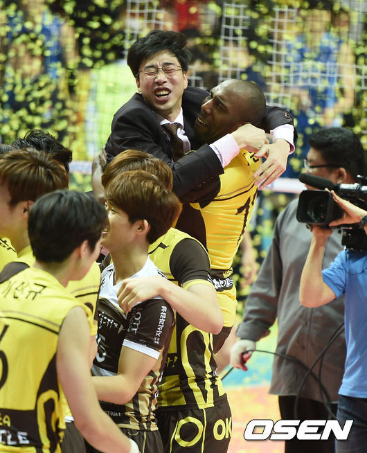 OK저축은행 김세진 감독과 시몬이 우승을 기뻐하고 있다. /jpnews@osen.co.kr