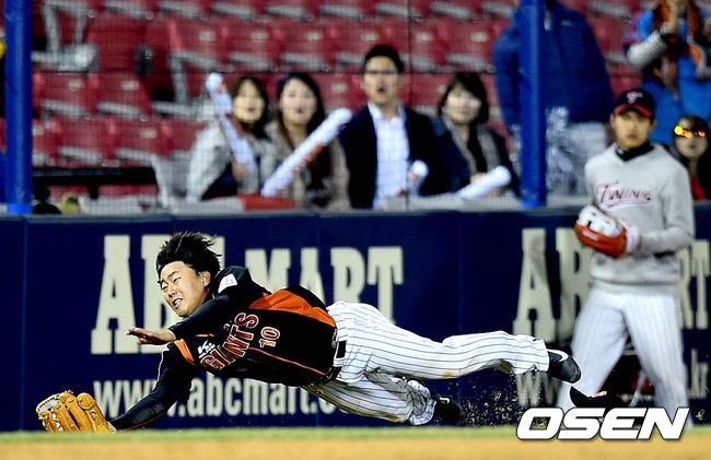 8회말 LG 공격 1사 1, 2루 상황 김용의의 파울 타구를 롯데 좌익수 하준호가 몸을 날리며 잡아내고 있다.