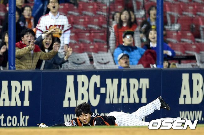 8회말 LG 공격 1사 1, 2루 상황 김용의의 파울 타구를 롯데 좌익수 하준호가 몸을 날리며 잡아내고 있다.